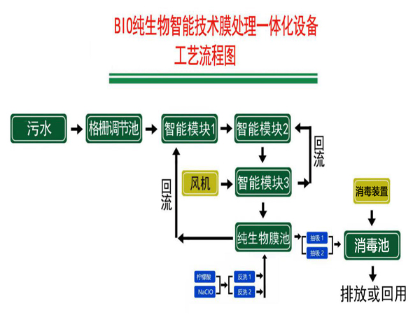 污水來水經(jīng)污水管道進(jìn)入格柵調(diào)節(jié)池,格柵調(diào)節(jié)池對污水進(jìn)行水量和水質(zhì)的調(diào)節(jié)和均化以及固液分離,調(diào)節(jié)池的污水通過動力提升進(jìn)入智能模塊區(qū),對其進(jìn)行水解酸化通過污泥回流液中的聚磷菌釋放磷酸根并消解部分有機(jī)物,智能模塊區(qū)的污水通過自流進(jìn)入智化模塊2區(qū)通過回流混合液的亞確酸鹽及硝酸鹽在反硝化菌的作用下生成氮?dú)忉尫牛M(jìn)一步的降解污水中的有機(jī)物。智能模塊3區(qū)內(nèi)通過風(fēng)機(jī)給微生物提供氧氣,保證微生鋤正常的活動進(jìn)行分解污水中的有機(jī)物,智能模塊3區(qū)內(nèi)污水道流到智能技術(shù)膜反應(yīng)池通過產(chǎn)水自吸泵連接浸入式膜組件,污水通過膜組件產(chǎn)水。污水進(jìn)入進(jìn)入消毒池,生物膜池濃縮污泥回流至智能模塊1繼續(xù)參與釋放并保持系統(tǒng)活性污泥濃度,另一部分則攜帶超量吸收的磷以剩余污泥的形式定期排出系統(tǒng)。