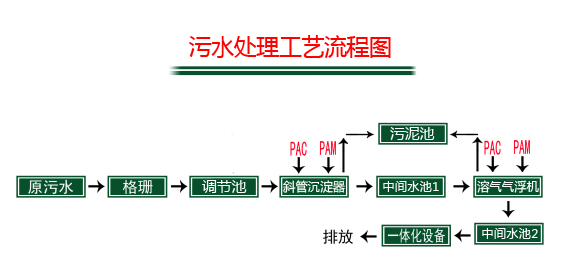 污水通過格柵渠自流進(jìn)入調(diào)節(jié)池(業(yè)主土建),調(diào)節(jié)池內(nèi)的污水通過設(shè)置的污水泵抽取進(jìn)入斜管沉淀器,在泥渣懸浮層上方安裝傾角60度的斜管組件,使原水中的懸浮物、固體物或經(jīng)投加混凝劑后形成的絮體礬花,在斜管底側(cè)表面積積聚成薄泥層,依靠重力作用滑回泥渣懸浮層,繼而沉入集泥斗。出水進(jìn)入中間水池1,經(jīng)泵提進(jìn)入溶氣氣浮機(jī),由空氣壓縮機(jī)送到空氣罐中的空氣通過射流裝置被帶入溶氣罐,在0.35Mpa壓力下被強(qiáng)制溶解在水中,形成溶氣水,送到氣浮槽中。在突然釋放的情況下,溶解在水中的空氣析出,形成大量的微氣泡群,同泵送過來的并經(jīng)加藥后正在絮凝的污水中的懸浮物充分接觸,并在緩慢上升過程中吸附在絮集好的懸浮物中,使其密度下降而浮至水面,達(dá)到去除SS和CODcr的目的。出水自流進(jìn)入中間水池2,經(jīng)泵提進(jìn)入一體化設(shè)備,A/O工藝將前段缺氧段和后段好氧段串聯(lián)在一起,A段DO不大于0.2mg/L,O段DO=2~4mg/L。在缺氧段異養(yǎng)菌將污水中的淀粉、纖維、碳水化合物等懸浮污染物和可溶性有機(jī)物水解為有機(jī)酸,使大分子有機(jī)物分解為小分子有機(jī)物,不溶性的有機(jī)物轉(zhuǎn)化成可溶性有機(jī)物,當(dāng)這些經(jīng)缺氧水解的產(chǎn)物進(jìn)入好氧池進(jìn)行好氧處理時,可提高污水的可生化性及氧的效率;在缺氧段,異養(yǎng)菌將蛋白質(zhì)、脂肪等污染物進(jìn)行氨化游離出氨(NH3、NH4+),在充足供氧條件下,自養(yǎng)菌的硝化作用將NH3-N(NH4+)氧化為NO3-,通過回流控制返回至A池,在缺氧條件下,異氧菌的反硝化作用將NO3-還原為分子態(tài)氮(N2)完成C、N、O在生態(tài)中的循環(huán),實現(xiàn)污水達(dá)標(biāo)排放。